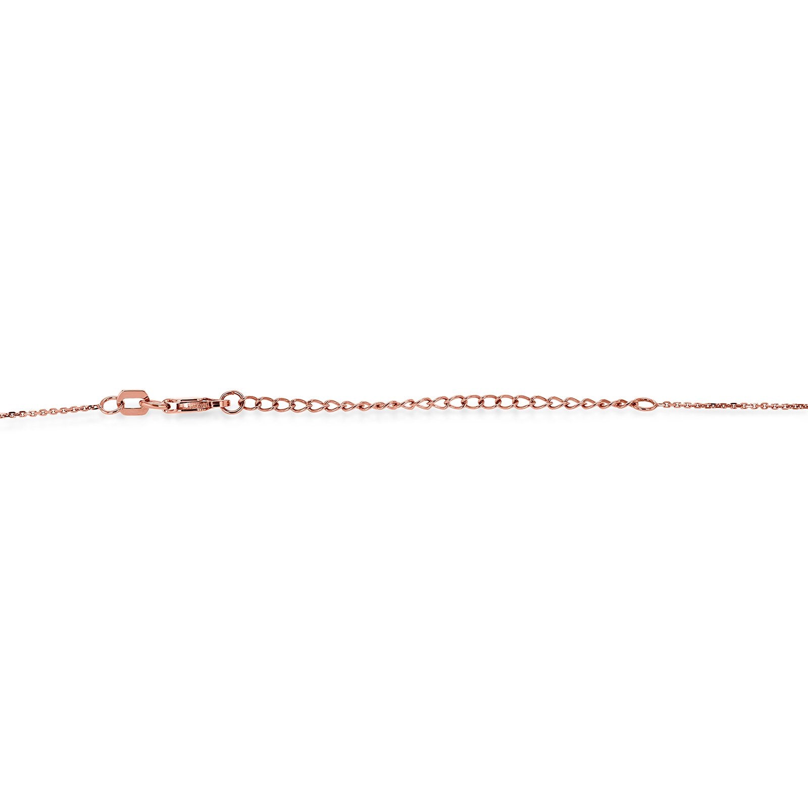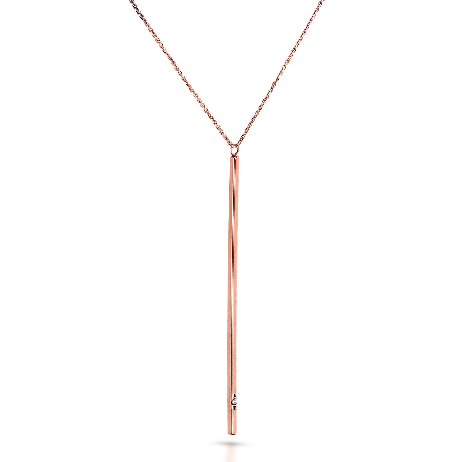 An ultra shiny rose gold chain carries a slender rose golden bar pendant for copper-toned minimalist perfection. Elevating the upscale persona of this elegant piece is a tiny 0.05 carat diamond accenting the bar in a flushed bezel setting. A two inch cable chain extension offers adjustable lengths from between 16 to 18 inches with a lobster clasp to best fit to your current ensemble.
