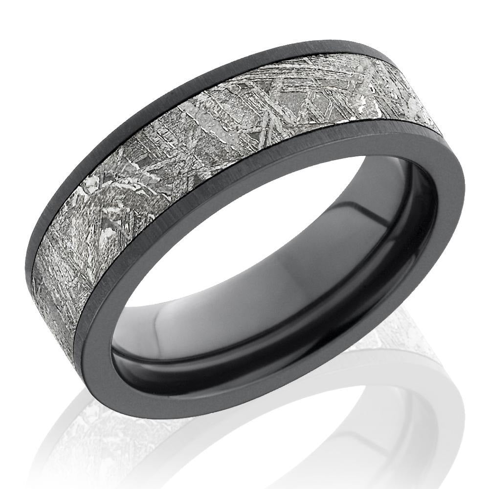 Carry a piece of the universe in the palm of your hands with this rarity of meteorite and black zirconium material. The meteorite inlay runs 5 mm wide along the middle of this 7 mm band. Designed for comfort and personality, this mens ring is suitable both as a fashion ring and as a wedding band.