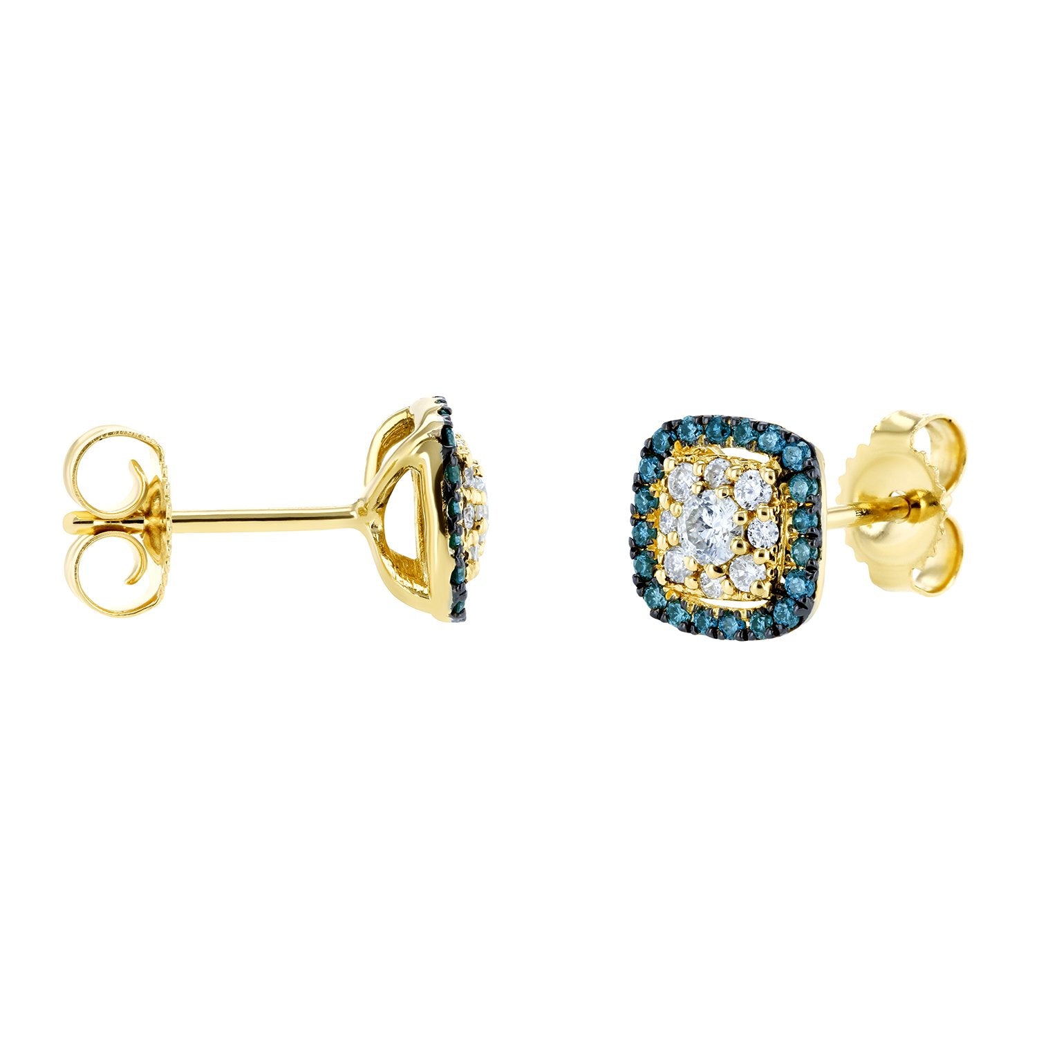 A halo of treated blue diamonds draws an outline around a central cluster of white diamonds in 14-karat yellow gold. These fashionable stud earrings present a shimmer of sparkles from the high diamond count. Securing easily with traditional butterfly clasps, this pair is a classic addition to any jewelry collection.