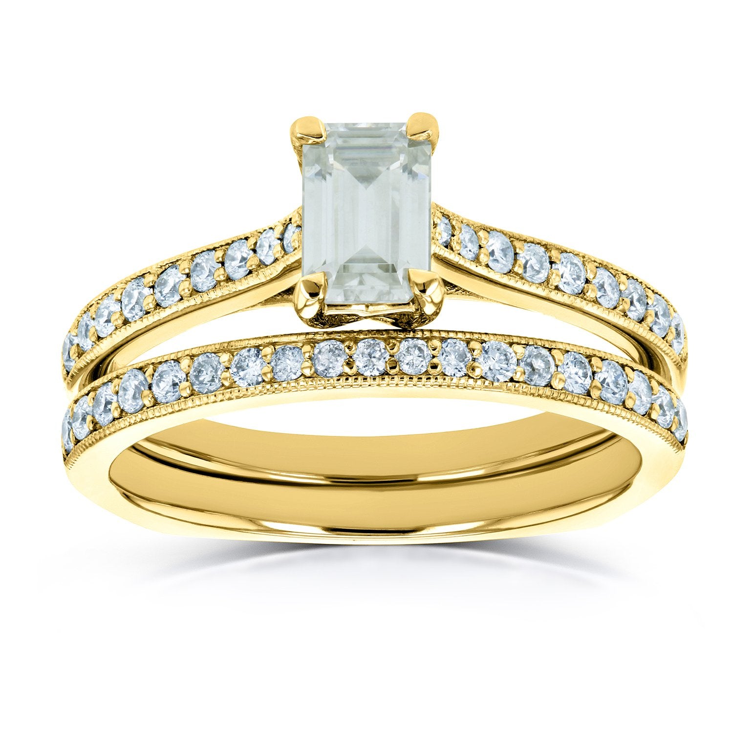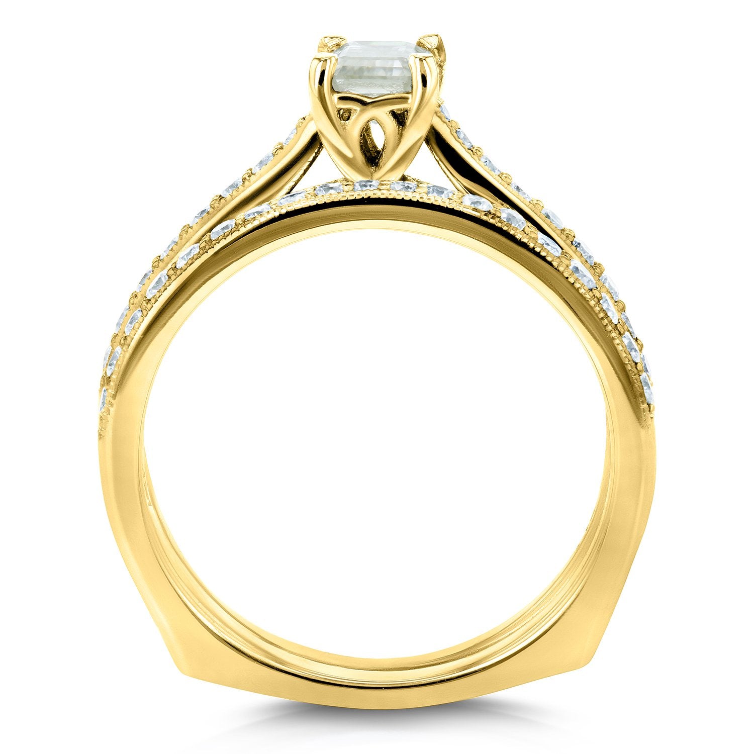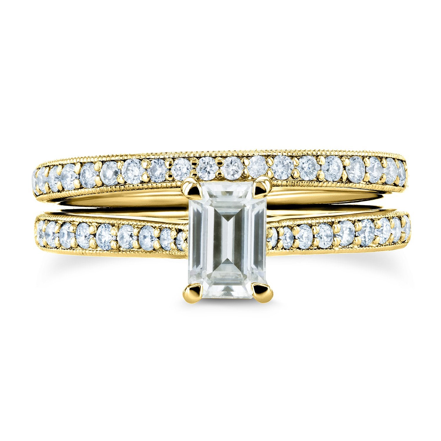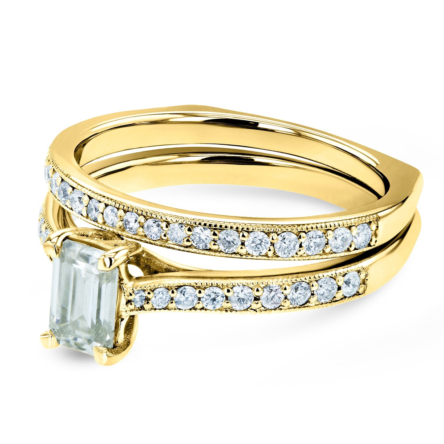 An emerald-cut moissanite is held with an x-prong trellis setting over fourteen-karat gold and pave-set side diamonds. The diamonds are all genuine stones harvested from the earth from conflict-free sources. The center moissanite gemstone is a lab-created perfected stone made to uphold the strength of a diamond while sparkling even greater than one with its famed fire power. The moissanite selected here is of near colorless GH color grade meaning it carries natural warm undertones for a more traditional look. The bands on this pair of rings are decorated with vintage style milgrain edges which instantly enhances the dazzling diamonds with a dynamic of textures and a captivating appearance fit for royalty. The smart design of this wedding set features a square shank known as a European shank to help keep the rings from spinning off center as you wear it.