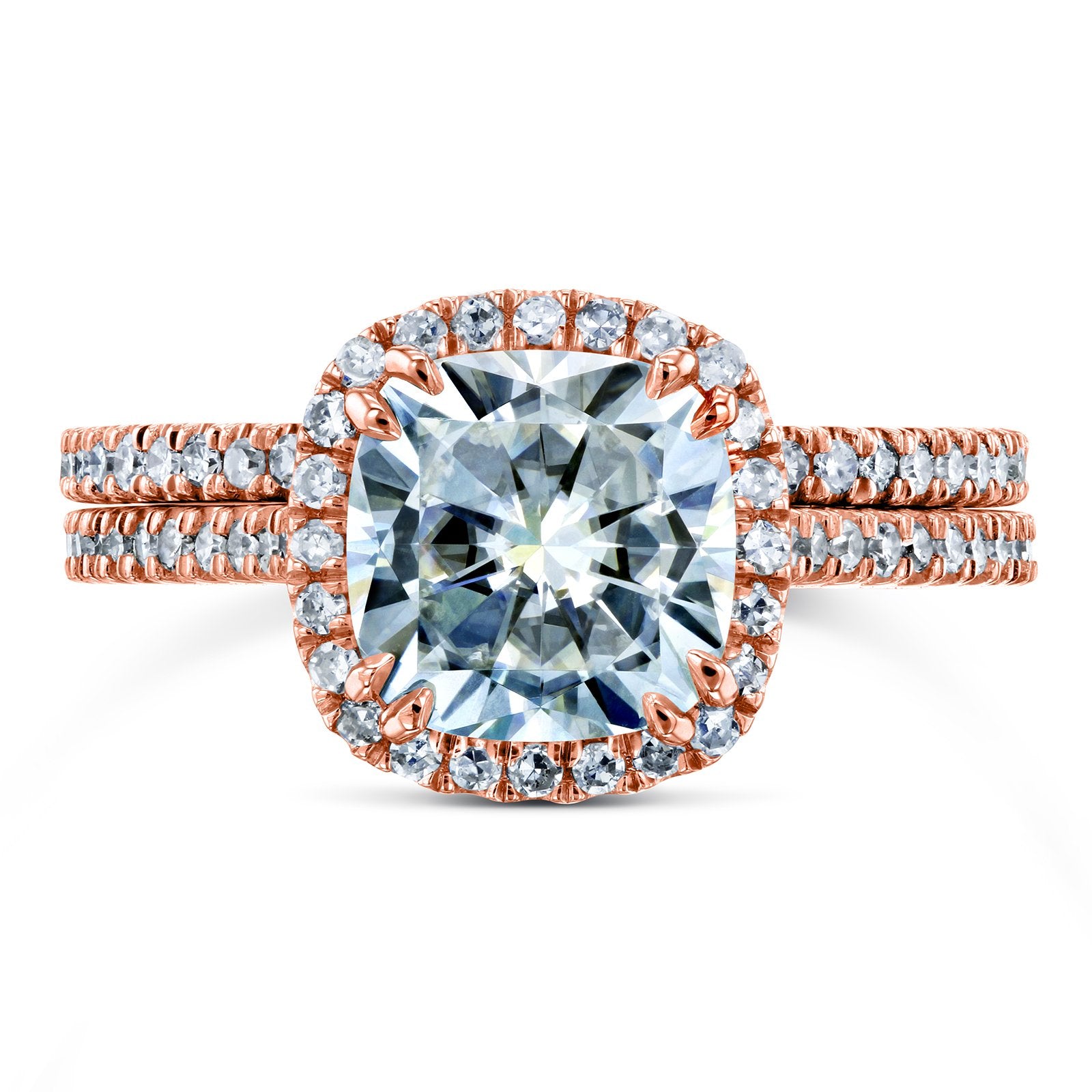 A 2 carat cushion-cut moissanite captures the most brilliant of sparkles over this diamond and gold bridal set. Decorating this moissanite center stone are entirely natural earth mined diamonds for a perfect mix of contemporary and tradition. The moissanite showcases pristine clarity whereas the diamonds showcase shimmering luxury. The rings are made with 14-karat rose gold and are finished with a beautiful high polish.