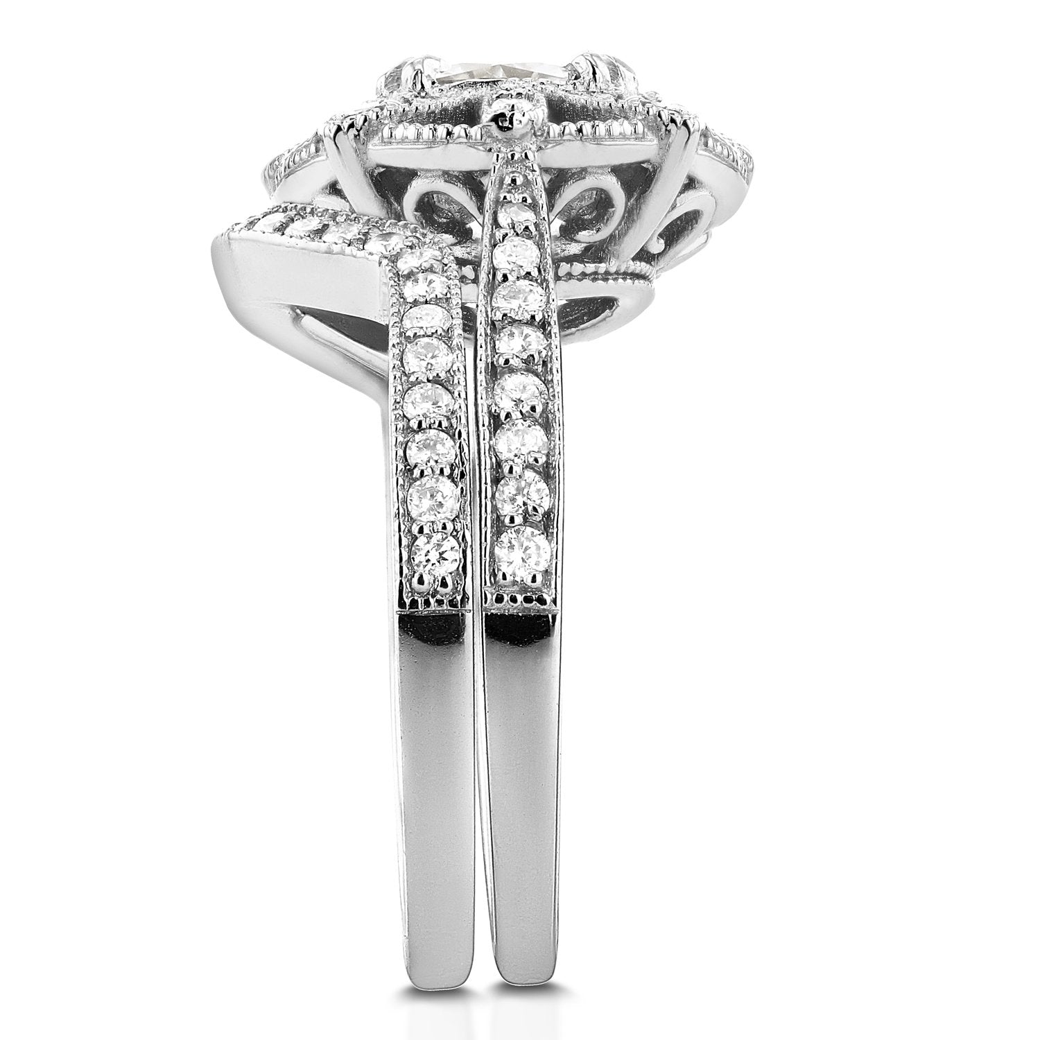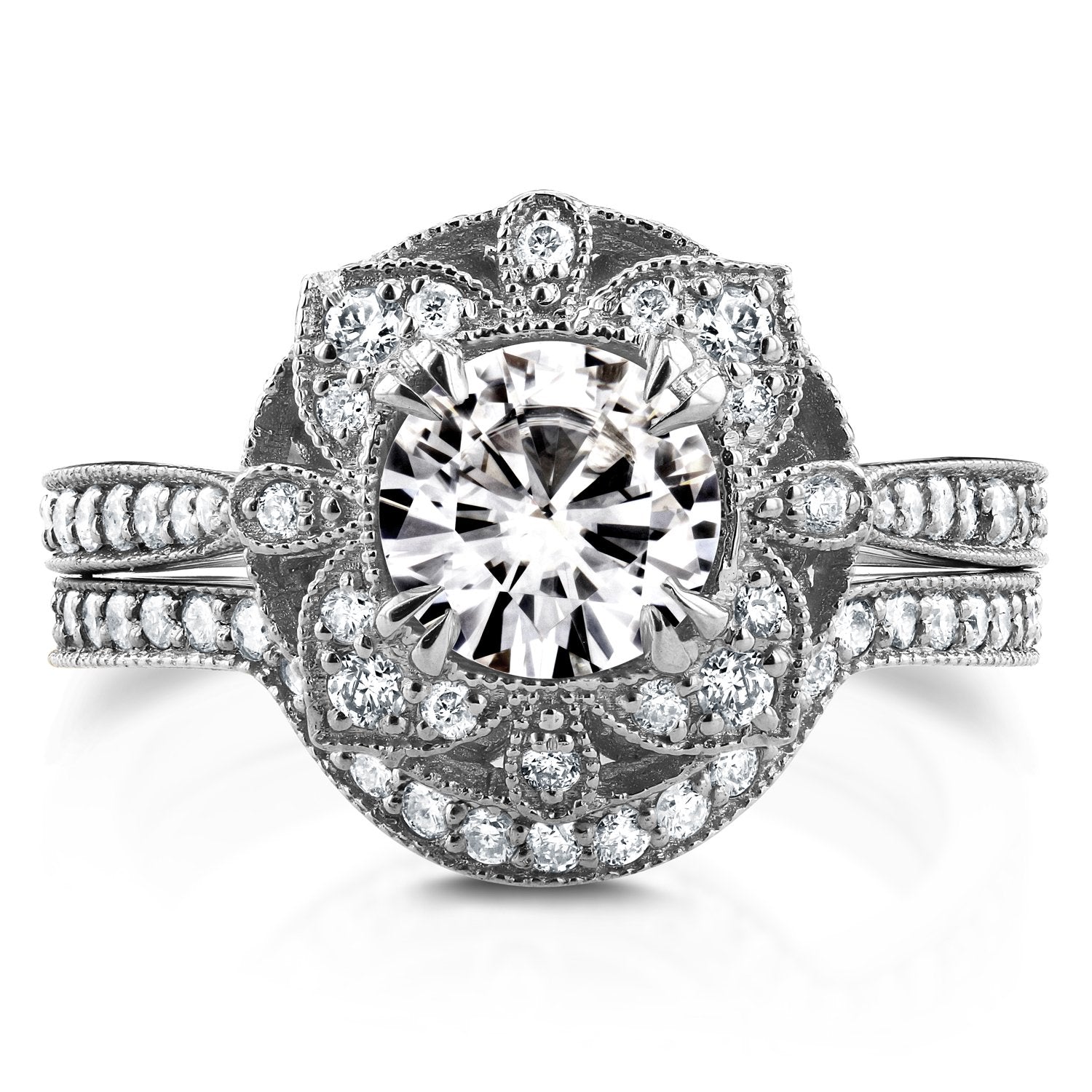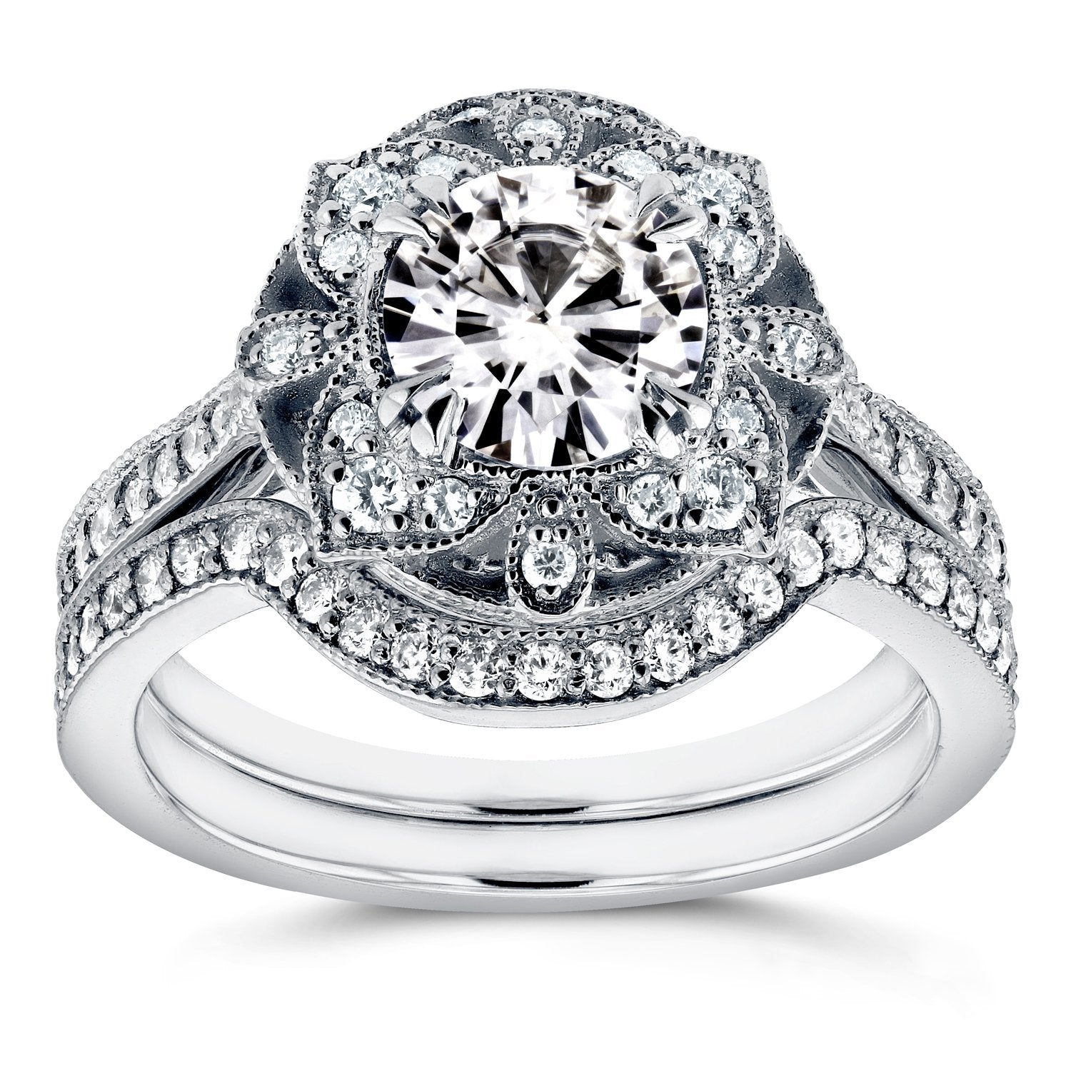 Antique Floral Round Moissanite and Diamond Bridal Set 1 1/2 CTW in 14k White Gold