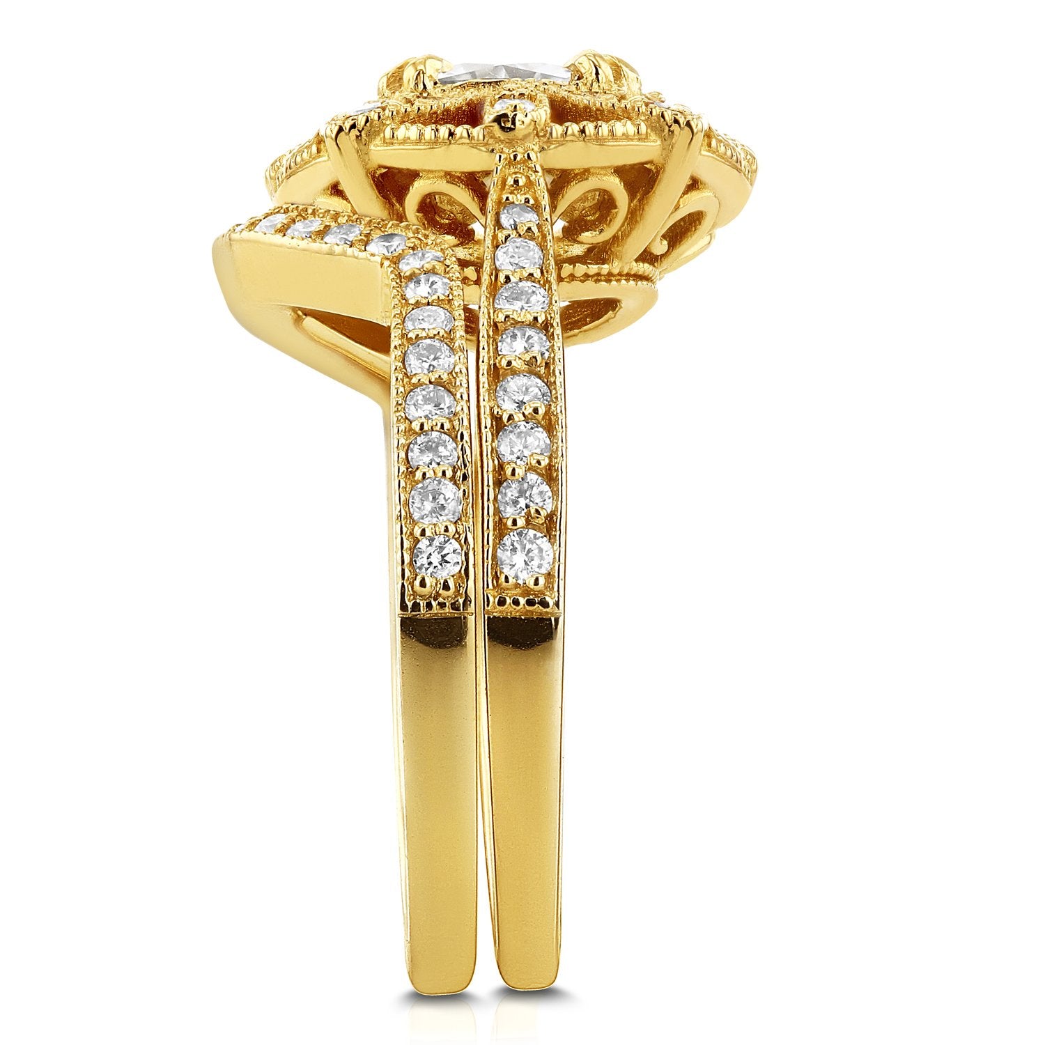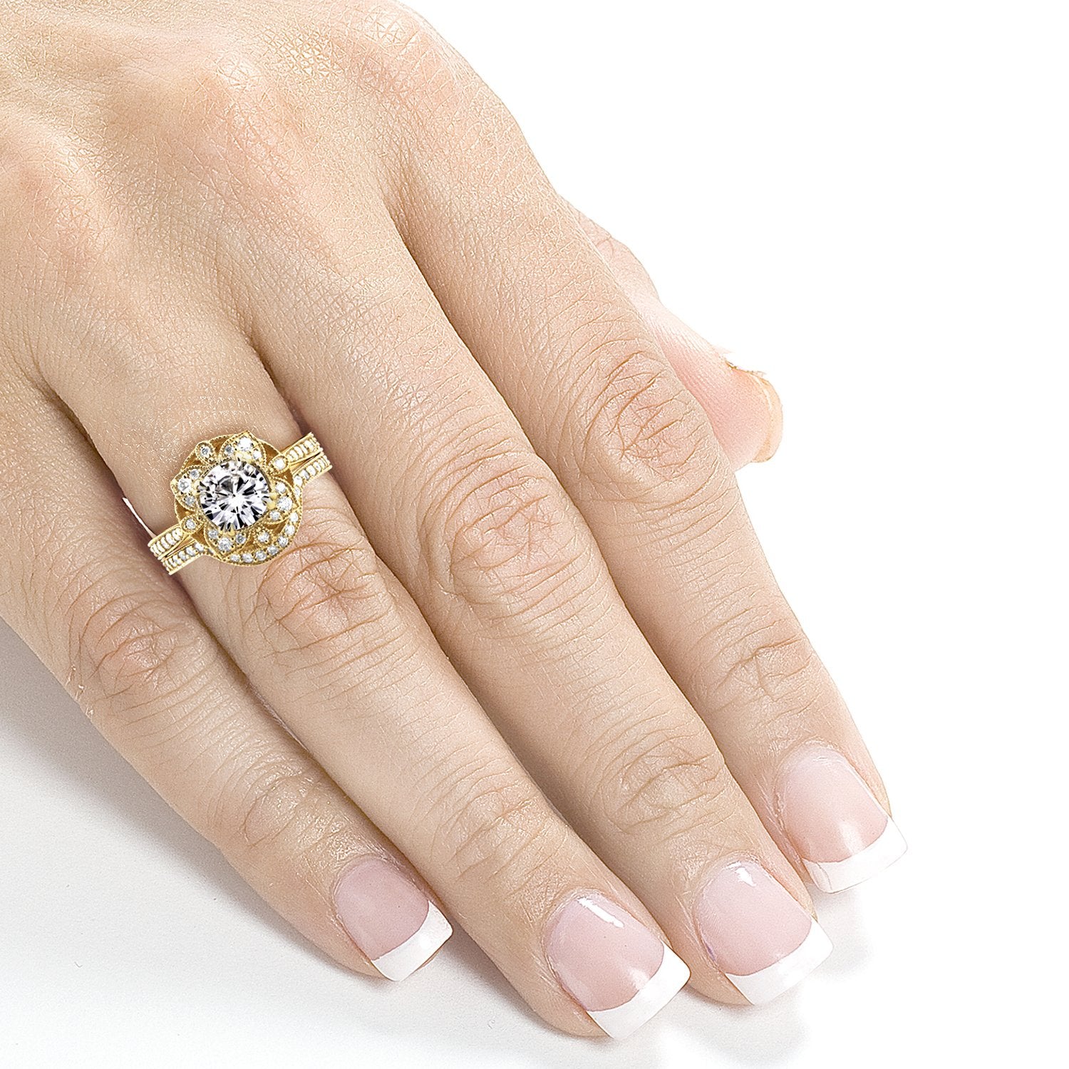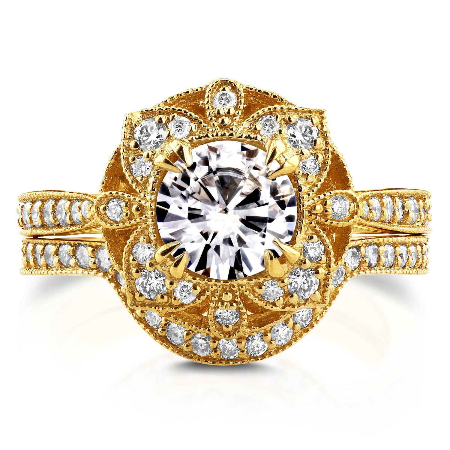 Antique Floral Round Moissanite and Diamond Bridal Set 1 1/2 CTW in 14k Yellow Gold