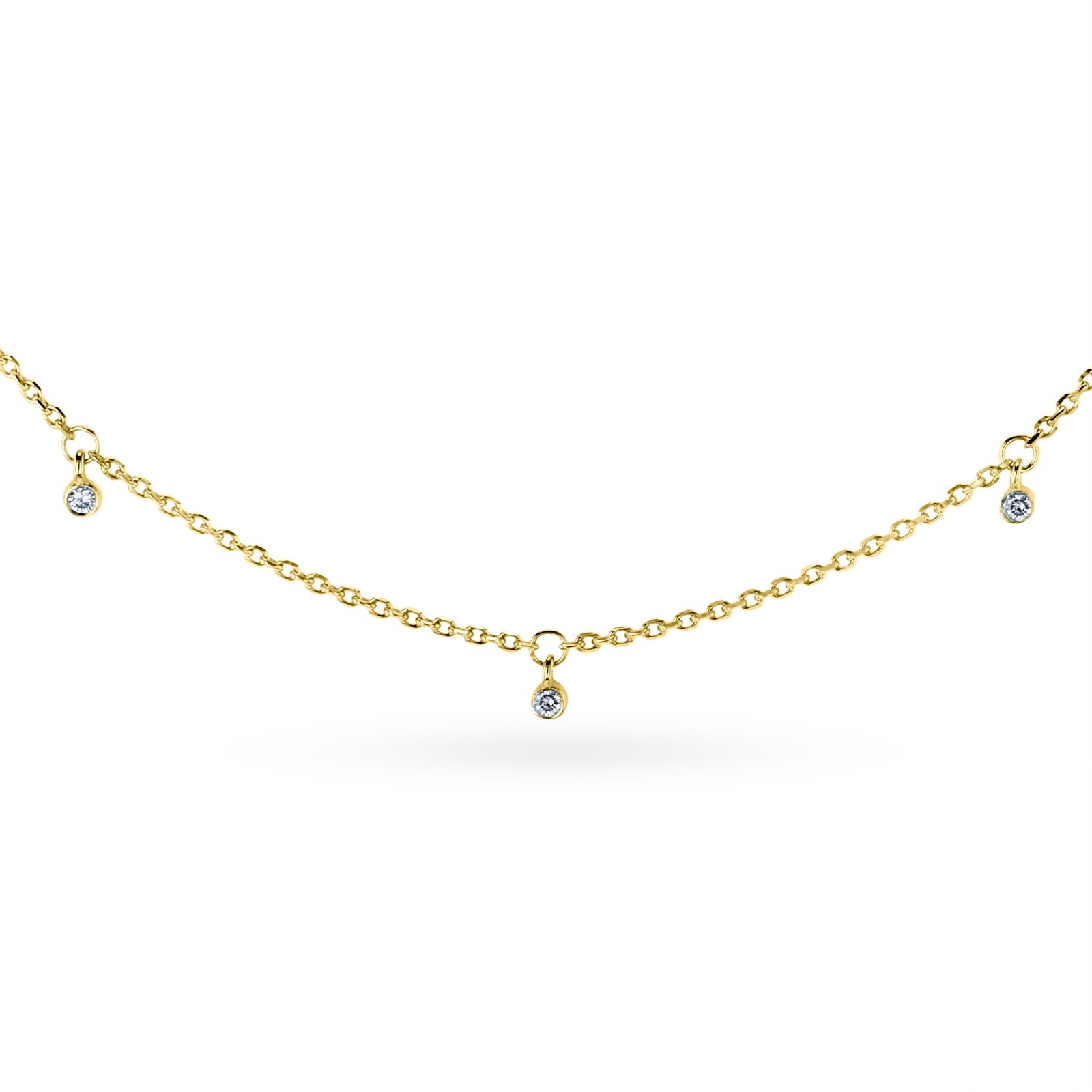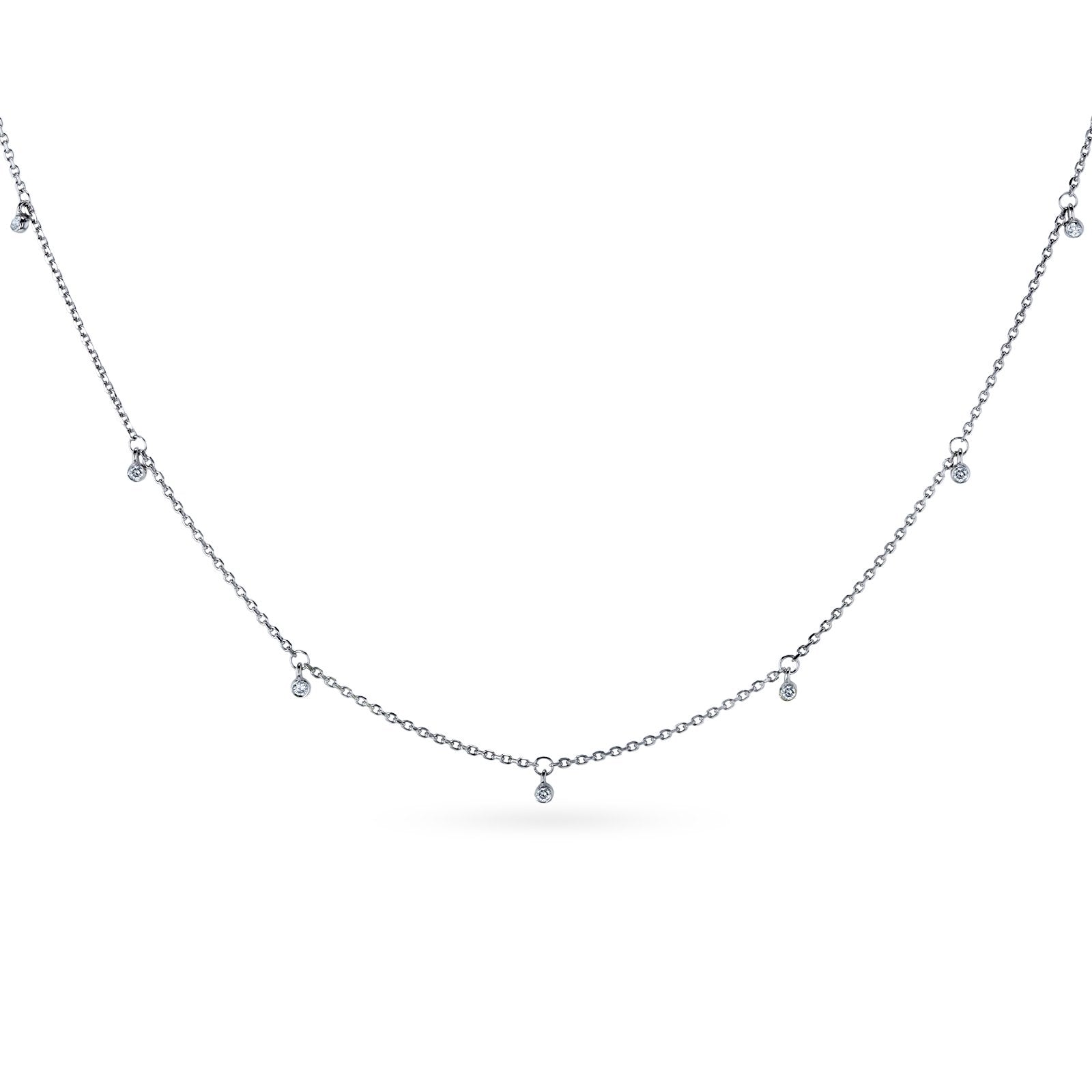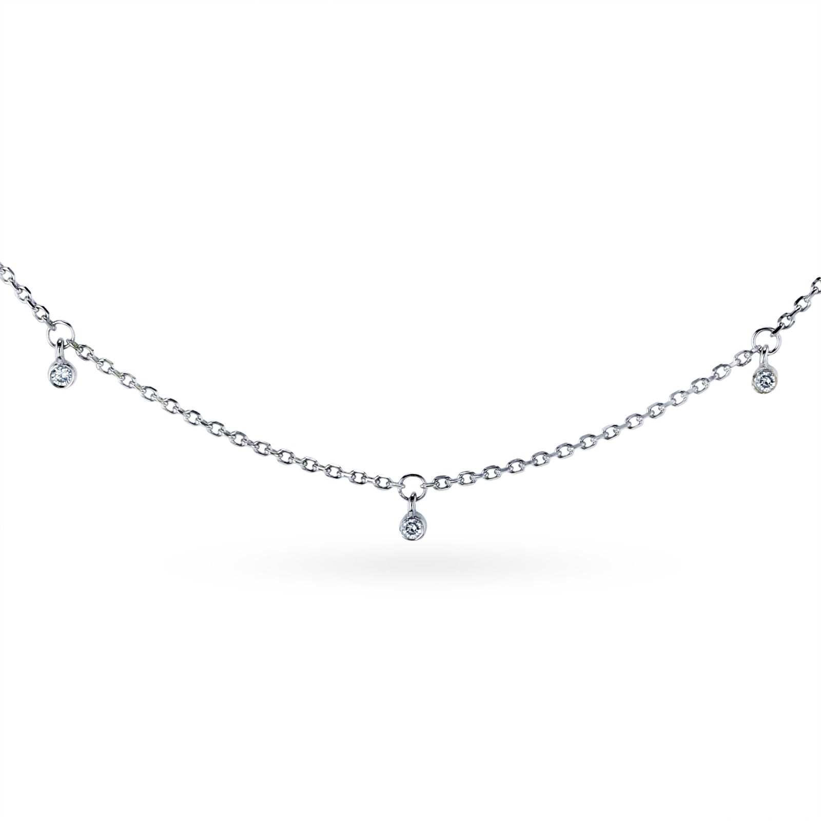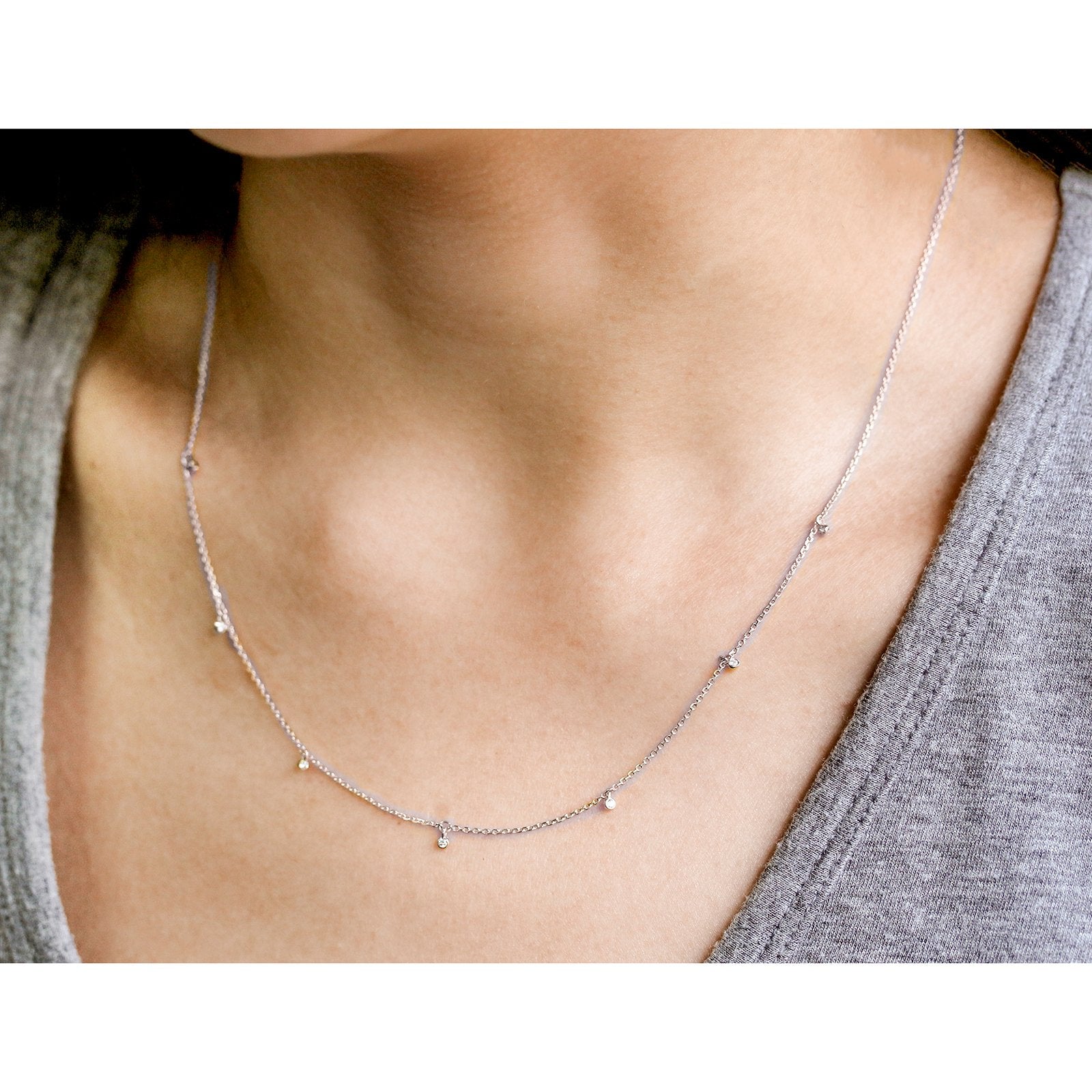 Seven diamonds drop along this station necklace in one inch intervals. Showcasing posh and spice with everything nice, this elegant piece will grace your ensemble with a breath of modest refinement in an instant. A total of 0.08 carat diamonds complete the piece in solid 14-karat gold. Each diamond is affixed by a bezel setting. The cable chain secures at an adjustable 16 or 18 inches long.